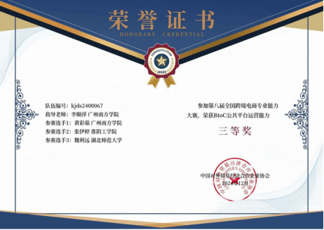 参赛期间,李顺萍老师耐心答疑单证问题,最终李顺萍老师荣获第八届全国跨境电商专业能力大赛“优秀指导老师”。学生此次获奖,不仅是对其个人不懈努力的高度肯定,更是对我校跨境电商专业教育品质的有力认可。这一荣誉将激发更多学生踊跃投身专业学习与实践活动,有力推动我校跨境电商专业持续进步。未来,艾弗森贝博ballbet官网会持续创新教育教学模式,借助赛事促进教学相长,培育出更多富有创新思维与实践才能的电商领域杰出人才。