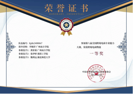 本次竞赛由中国对外贸易经济合作企业协会举办,学生组决赛共有3个赛道,分别为跨境电商物流赛道、跨境电商BtoC公共平台运营赛道以及跨境电商独立站策划与运营赛道,我校艾弗森贝博ballbet官网国际经济与贸易专业黄彩茹同学与淮阴工学院张伊婷、湖北师范大学魏利远同学组成的参赛队伍,在李顺萍老师指导下,参加跨境电商物流赛道与跨境电商BtoC公共平台运营赛道,经过团队半个多月努力练习,终不负众望,荣获全国一等奖和三等奖佳绩。