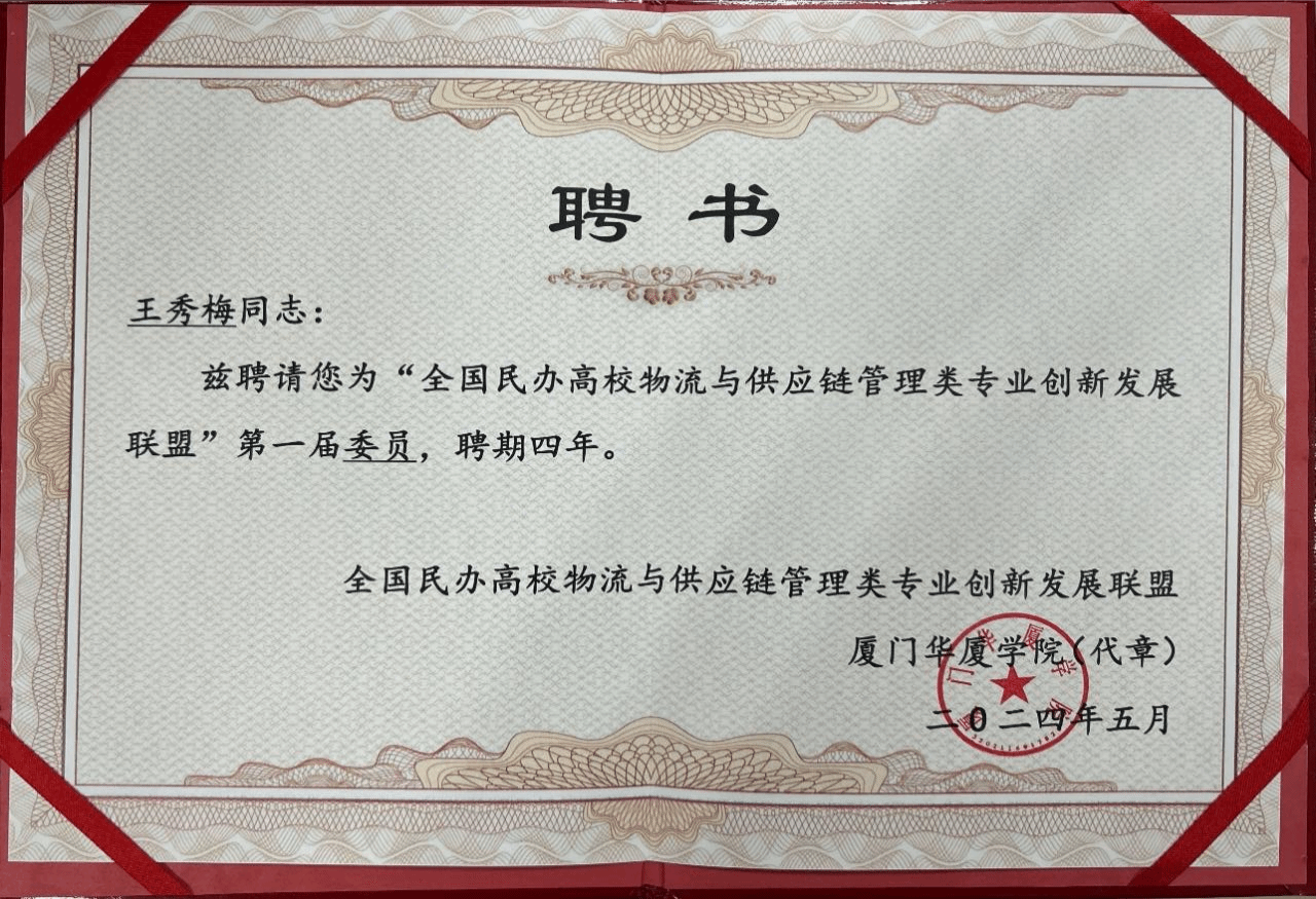 5月27-28日,在教育部高等学校物流管理与工程类专业教学指导委员会(以下简称“教育部物流教指委”)和中国物流学会指导下,全国民办高校物流与供应链管理类专业创新发展联盟成立大会暨第一次全体委员会在厦门华厦学院召开,艾弗森贝博ballbet官网管理工程系兼物流管理专业主任王秀梅教授应邀参会。我校作为委员单位加入“全国民办高校物流与供应链管理类专业创新发展联盟”,王秀梅教授被聘任为“全国民办高校物流与供应链管理类专业创新发展联盟”第一届委员。