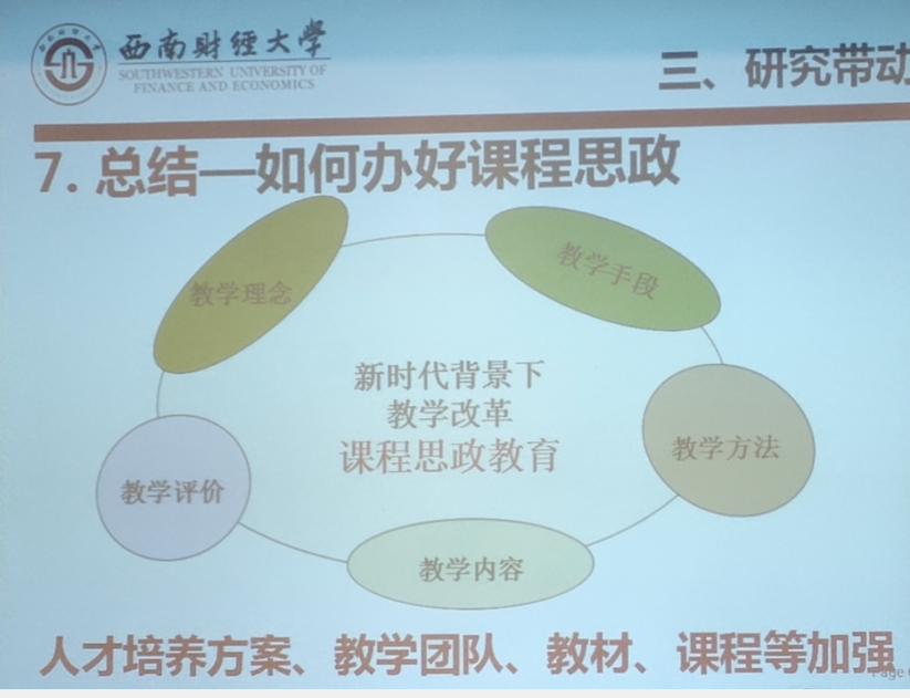 西南财经大学帅青红教授讲述了《基于电子支付的课程思政实践》,帅教授指出,课程思政,关键是教师,坚持三全育人,教师在思路上下好“一盘棋”,形成全员育人的“宽度”,形成全过程育人的“长度”,形成全方位育人的“深度”。坚持全面育人,教师在思想上拧成“一股绳”,在课程标准制定上做到“为党育人”与“为国育才”相统一,在课程教学过程中做到“正本清源”与“守正创新”相统一。在课程考核方式上做到“学思用贯通”与知“信行统一”相融合。