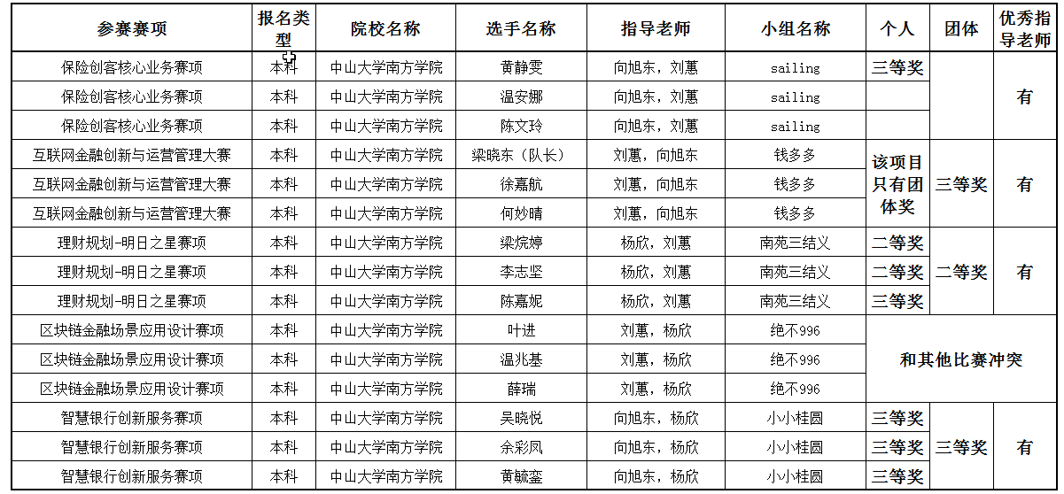 中山大学南方学院师生从2020年9月份开始着手准备校赛,从金融学院20余只队伍选拔出五个队伍,首次全面参加亚金协领头举办的全国金融创新大赛所有赛项,在整个备赛参赛过程中,参赛师生团结拼搏,努力进取,积极克服云比赛各种突发难题,以1项团体二等奖、2项团体等奖三、2项个人二等奖、4项个人三等奖,4项优秀指导老师奖(见表一),并且梁烷婷、李志坚、陈嘉妮同学获取美国RFP协会颁发的“助理职业规划师”资格认证书,杨欣、刘蕙老师获取美国RFP协会颁发的“职业规划师”资格认证书。