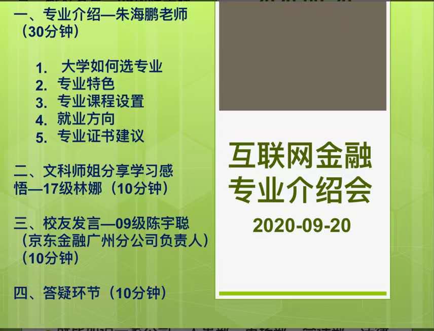 2020年9月20日上午,艾弗森贝博ballbet官网召开了为新生召开了互联网金融专业介绍会。本次专业介绍会由互联网金融专业主任朱海鹏老师主讲,出席会议的有目前任职京东金融广州分公司负责人的陈宇聪校友和17级的林娜师姐,及其一众互联网金融专业的教师们。本次介绍会旨在加深新生对本专业的认识,使学生们对互联网金融专业的学习和就业有充分的了解,给同学们提供未来发展路径的规划和设想。