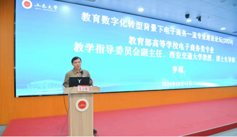 2024年12月14日,“教育数字化转型背景下电子商务一流专业建设论坛”在五邑大学召开。本次会议由广东省本科高校电子商务类专业教学指导委员会主办,由五邑大学经济管理学院承办。教育部高等学校电子商务类专业教学指导委员会副主任、西安交通大学李琪教授,教育部高等学校电子商务类专业教学指导委员会副主任、厦门大学彭丽芳教授,教育部高等学校电子商务类专业教学指导委员会委员、东北财经大学杨兴凯教授、广东省本科高校电子商务类专业教学指导委员会主任、华南师范大学邓顺国教授,广东省本科高校电子商务类专业教学指导委员会副主任、华南理工大学王和勇教授等多名专家学者及企业代表出席本次会议,共商教育数字化转型背景下电商行业发展及AI应用、一流专业建设、一流课程建设、行业发展与企业用人需求。