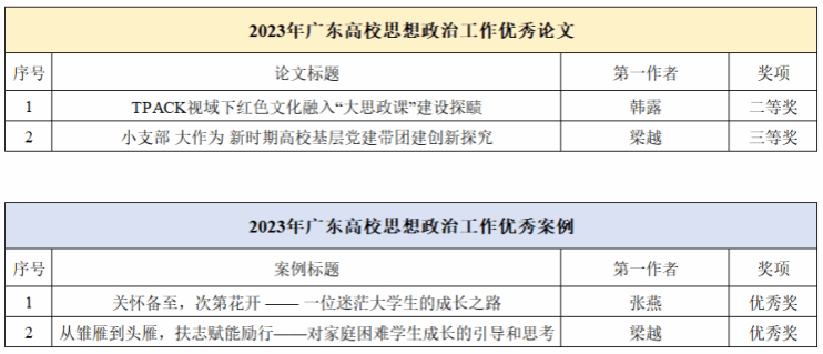 近日,由广东省高校思想政治工作队伍培训研修中心、广东省高等学校思想政治教育研究会组织开展的广东高校学生工作优秀论文、优秀案例、教学视频、原创文化精品推选展示活动评选结果揭晓,贝博官网六项成果在广东高校学生工作优秀案例评审中获奖,其中二等奖1项、三等奖1项、优秀奖4项。
