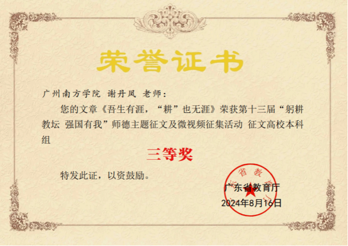 贝博官网谢丹凤老师获广东省第十三届师德主题征文三等奖