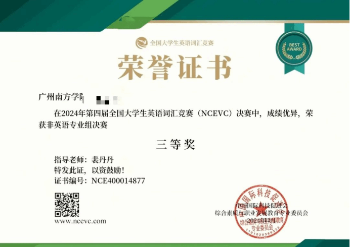 贝博官网裴丹丹老师指导学生参与全国大学生词汇竞赛获三等奖