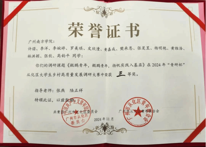 张燕老师、陆正祥老师指导学生队伍(鲲鹏青年共鸣社队)参加2024年“青研杯”荣获三等奖