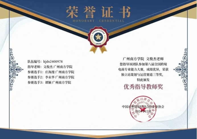 贝博官网文俊杰老师指导学生参与第八届跨境电商专业能力大赛-独立策划与运营获优秀指导老师奖