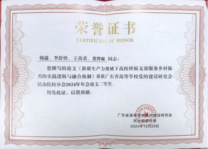 贝博官网韩露老师获广东省高等学校党的建设研究会民办院校分会2024年年会论文二等奖