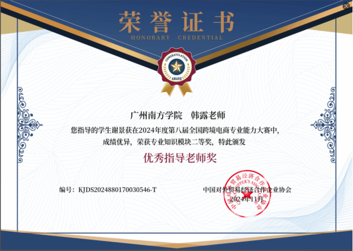 贝博官网韩露老师指导学生参与2024年度第八届全国跨境电商专业能力大赛获优秀指导老师奖