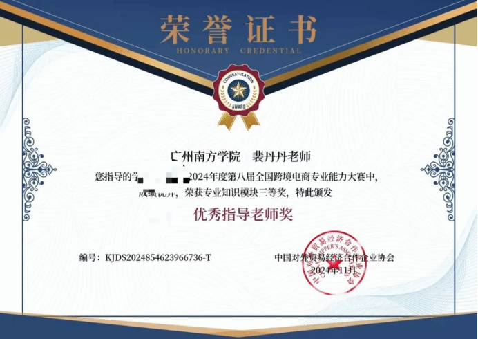 贝博官网裴丹丹老师指导学生参与2024年度第八届全国跨境电商专业能力大赛获优秀指导老师奖
