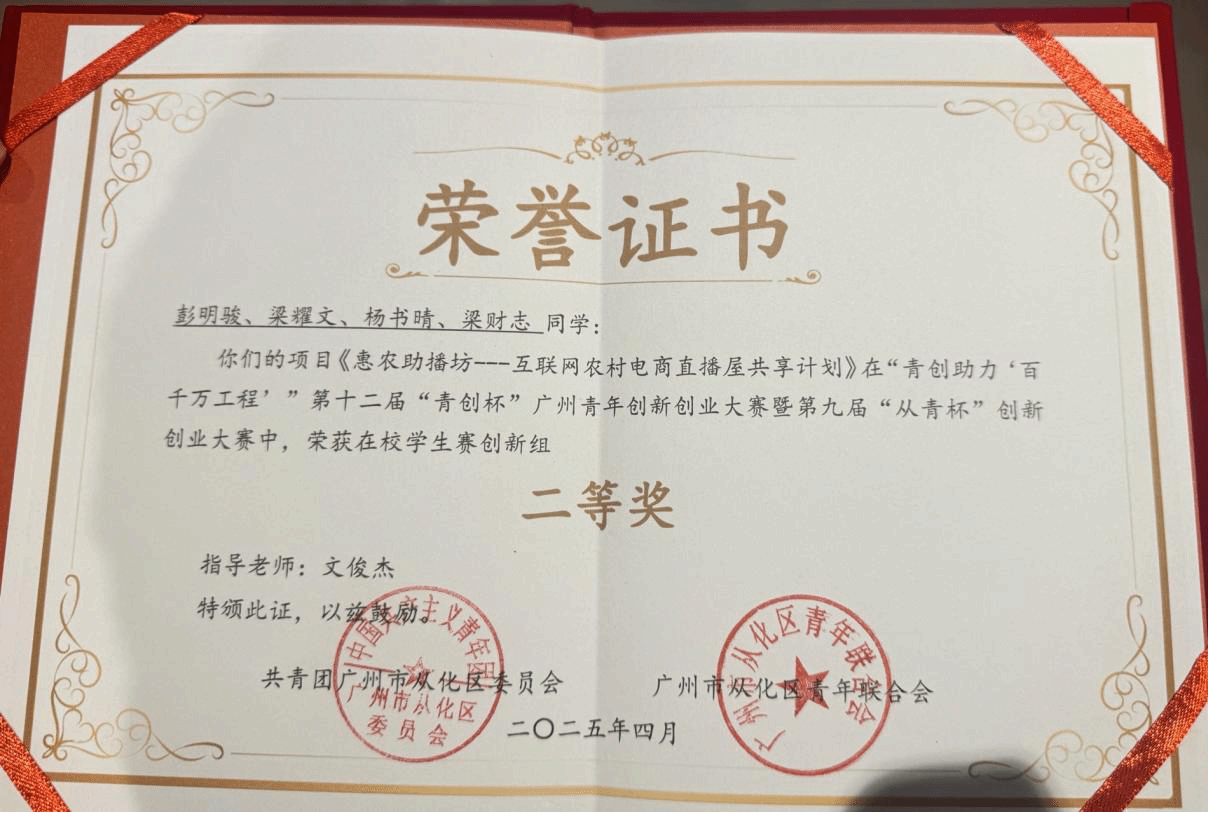由市青创中心、团区委、区人社局、区青联共同主办的广州市“青创助力‘百千万工程’”第十二届“青创杯”广州青年创新创业大赛暨第九届“从青杯”创新创业大赛总决赛于4月23日落下帷幕。贝博官网由彭明骏、梁耀文、杨书晴、梁财志同学组建的队伍,参赛的项目:《惠农助播坊---互联网农村电商直播屋共享计划》,在文俊杰老师指导下,荣获本赛事在校学生赛创新组二等奖。