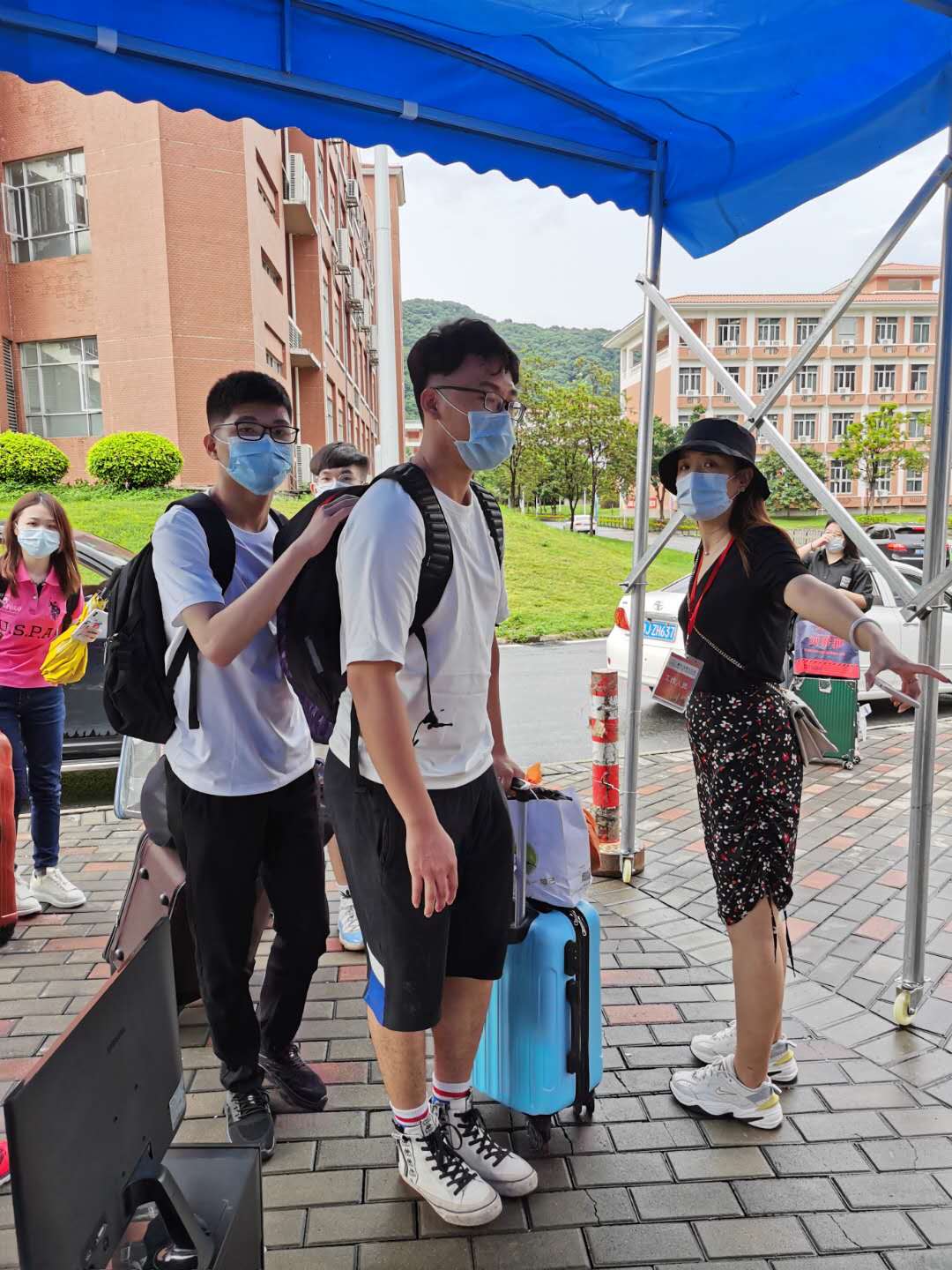 学校还专门安排了2辆校园巴士作为校内直通车接送返校学生前往宿舍。在宿舍入口,返校学生再次接受宿舍管理员体温检测,有序办理入住。