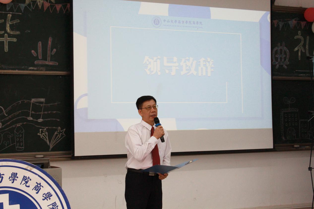 典礼伊始,中山大学南方学院副校长黄静波教授上台致辞。他对在毕业生寄予殷切期望,指出大学毕业是一种新开始,愿同学们投入工作后也能不断学习进步、充实自己,承担起肩上的责任,在负重中不断成长。