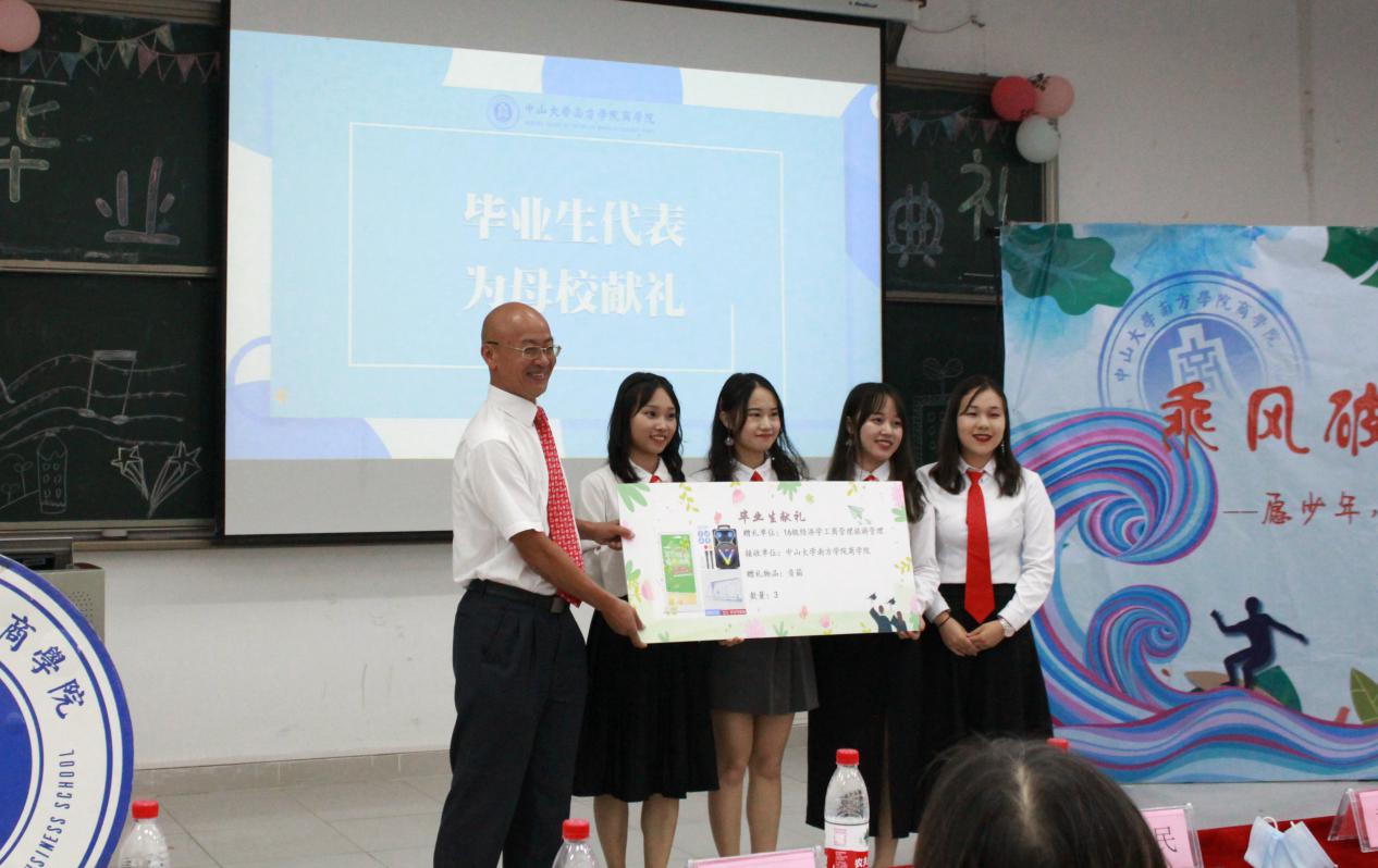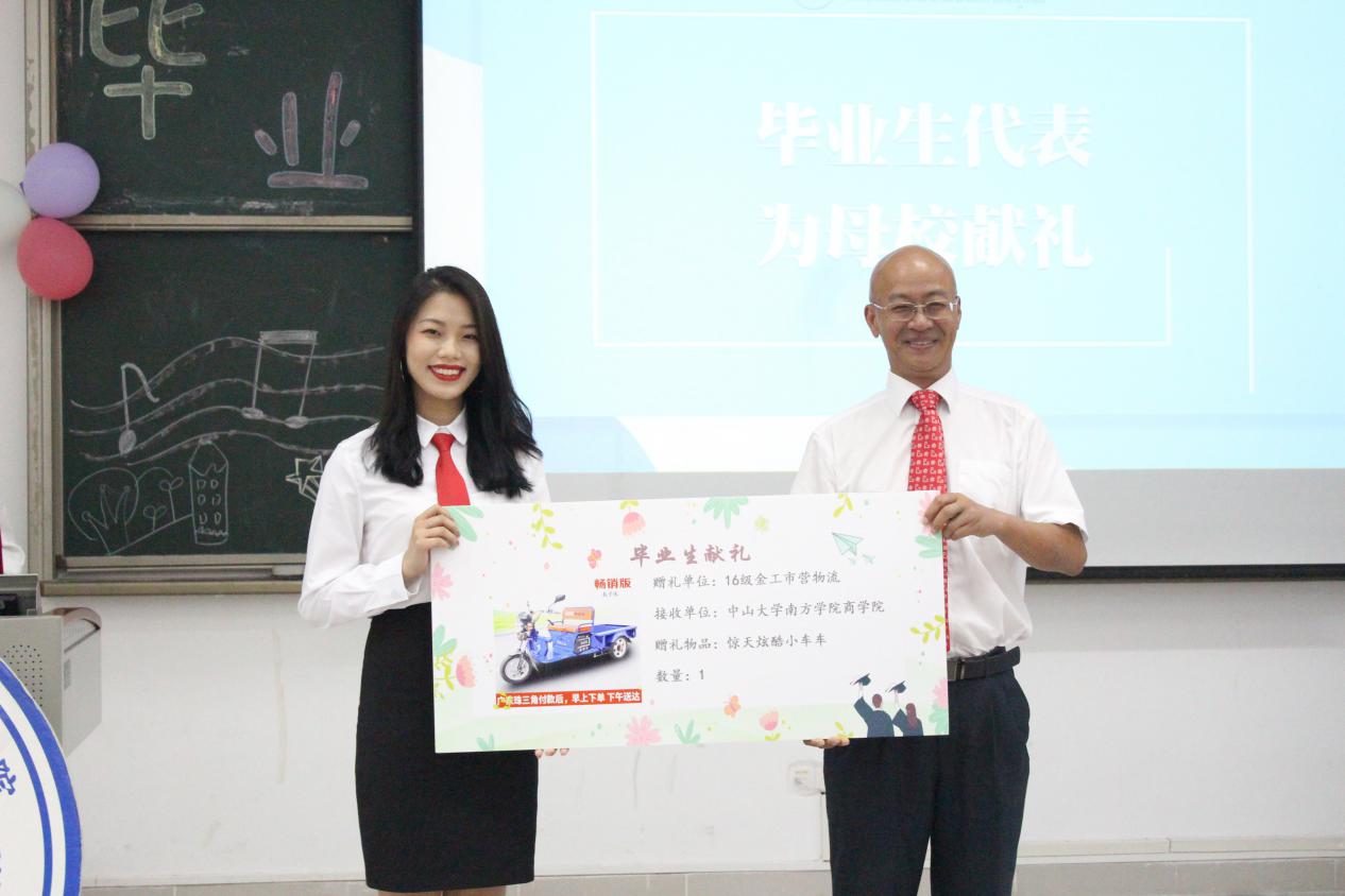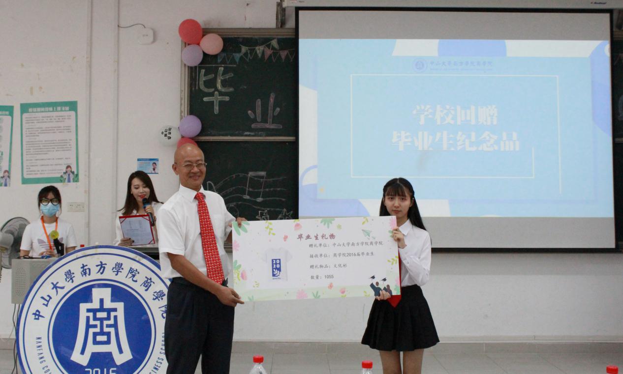 学校回赠毕业生纪念品,优秀毕业生代表吴明燕同学上台接受赠礼。
