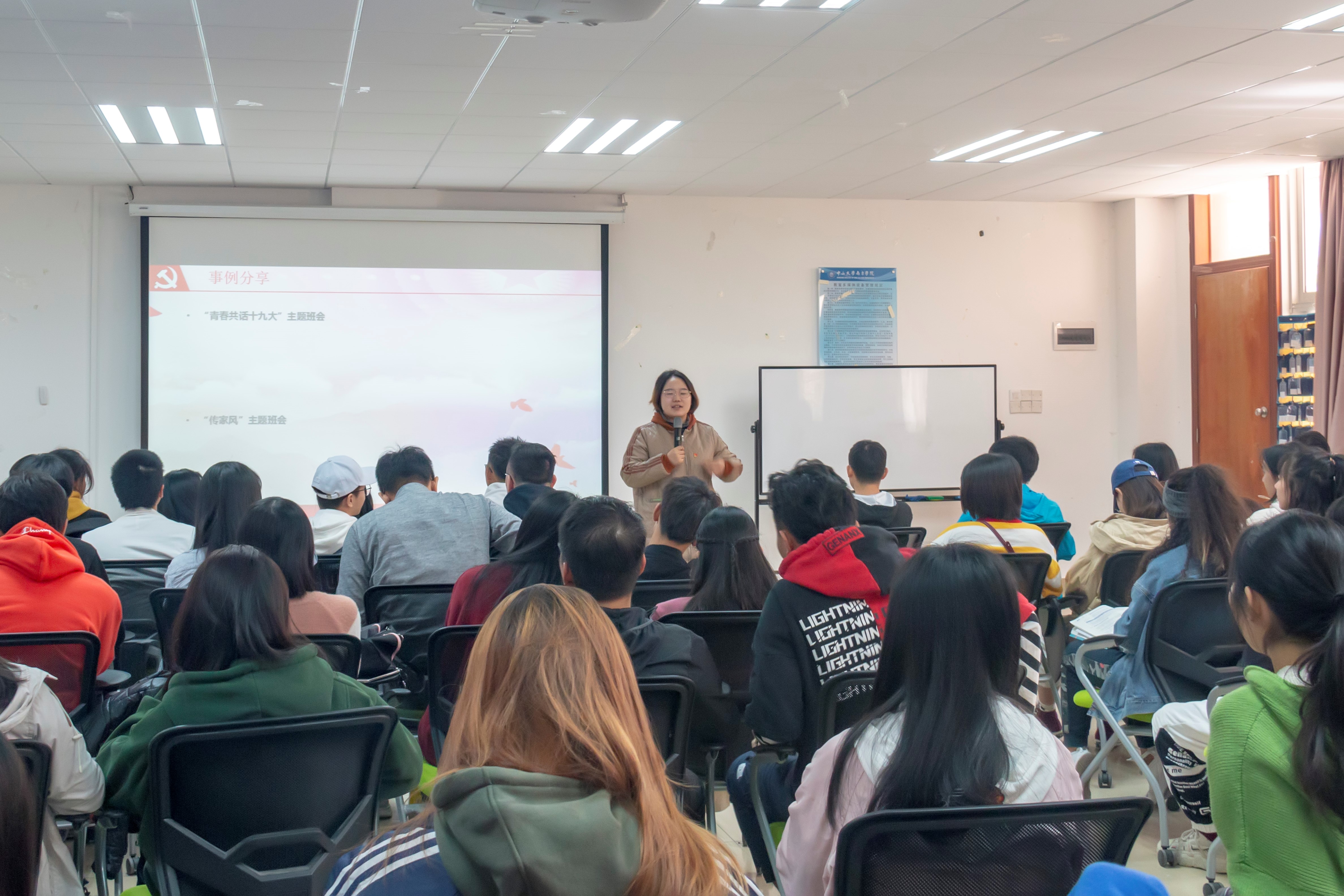 12月10日中午12点30分,政商党支部在九教101开展“不忘初心、牢记使命”主题教育——政商党支部“添柴助力”系列党团共建活动之“党员开讲啦”第一讲,由吴偲霖师姐以“大学生党员的奉献意识”为题,以身作则地为我们阐述了做讲奉献、有作为的大学生及合格党员的重要性及基本要求。其中偲霖师姐以她自身作为四年班长的经历为我们讲述了16政商2班的班风及班会开展情况,我们都与偲霖师姐进行了互动交流,获益良多。