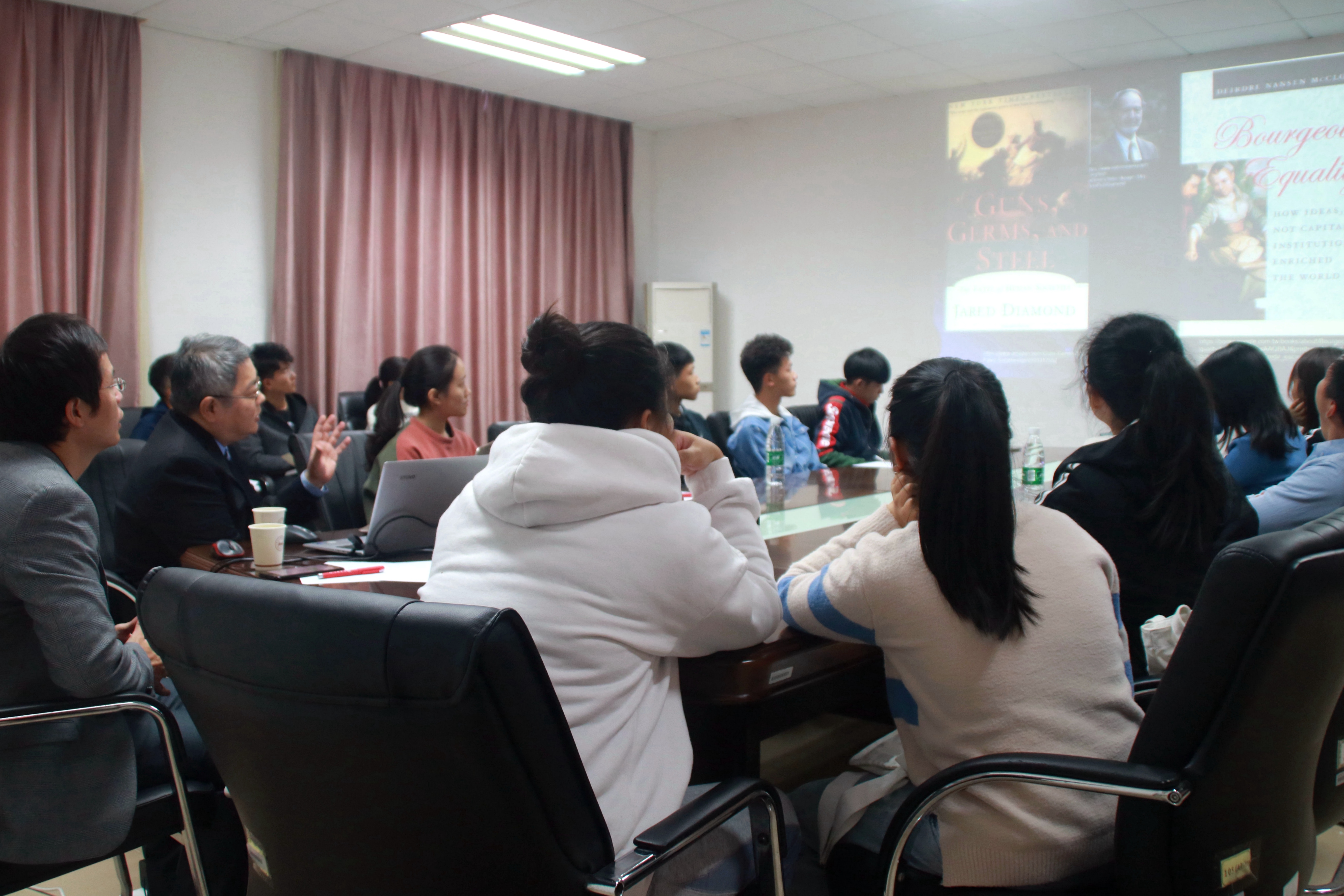 讲座伊始,陈树衡教授首先阐述了“网络双生子时代”的涵义,并以两本经济类书籍举例帮助同学们更好地理解地理因素以及人文因素对经济发展的影响。随后,陈树衡教授以“历史巨人古登堡”为例子,从经济学的角度切入分析古登堡的发明对推动西方经济发展起到的巨大作用。陈树衡教授通过分析工业革命对世界经济的影响,给同学们在如何分析未来经济发展趋势的问题上指明了一个方向。帮助同学们更好的认清当前经济发展的潮流。