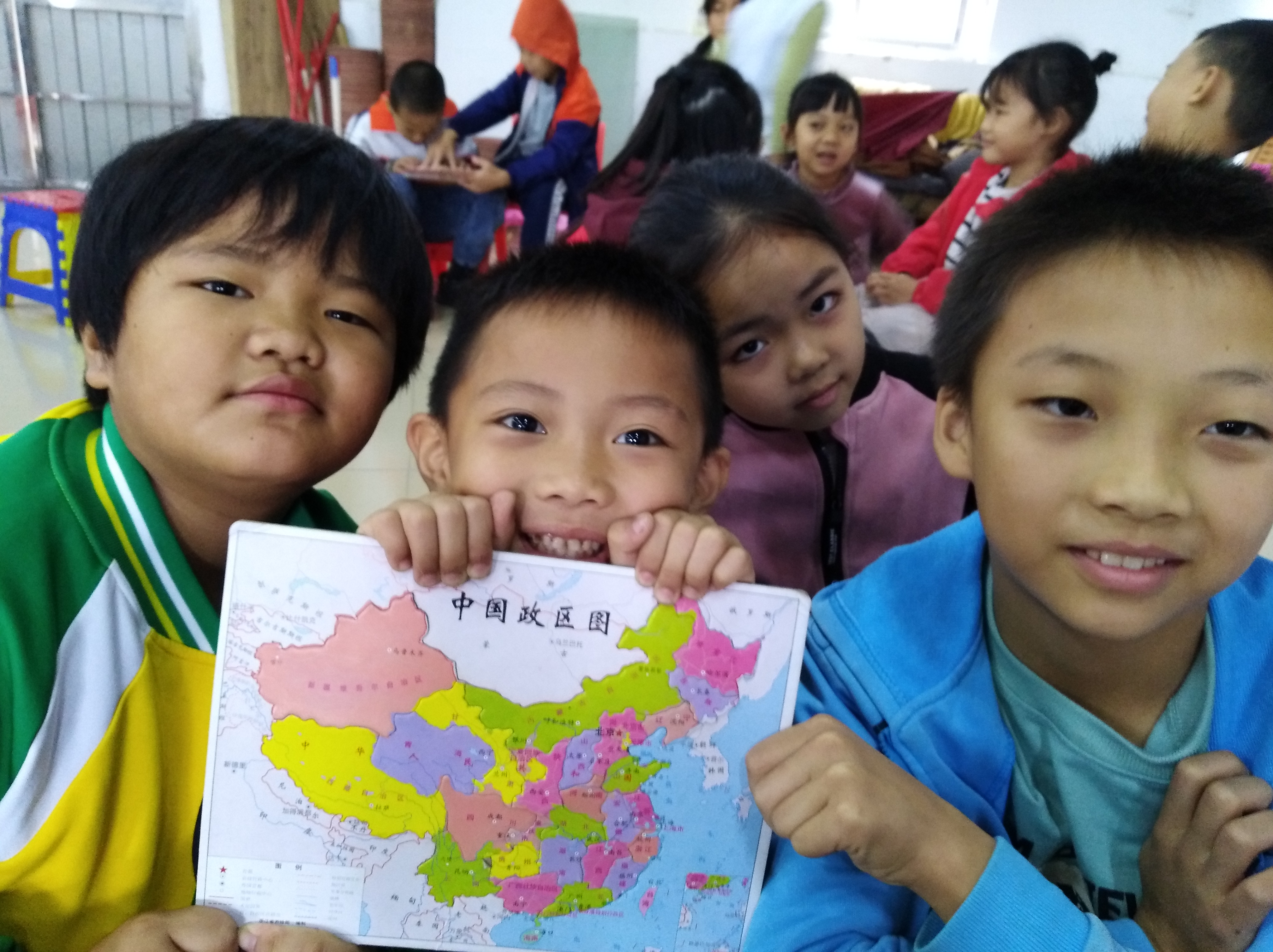 本次活动由六名党员与艾弗森贝博ballbet官网电子商务专业2017级4班团支部共同参与,主要以讲课的方式向小朋友们传授中国地理、中国历史等中国文化知识。地理课由朱文学同志进行讲授,讲课之前,朱文学同志先以浅显易懂的话语向小朋友们介绍了中国地图,之后便展开了分组拼图比赛,小朋友们分为四组,每一组都有一位志愿者负责协助,孩子们对于眼前的“大公鸡”拼图都兴致高昂,纷纷开动脑筋,遇到疑问时也会认真向志愿者们请教,最终,快速地将完整的地图拼好了。通过理论与动手实践相结合的方式,增强了他们对地理知识的了解和对世界探索的求知欲。