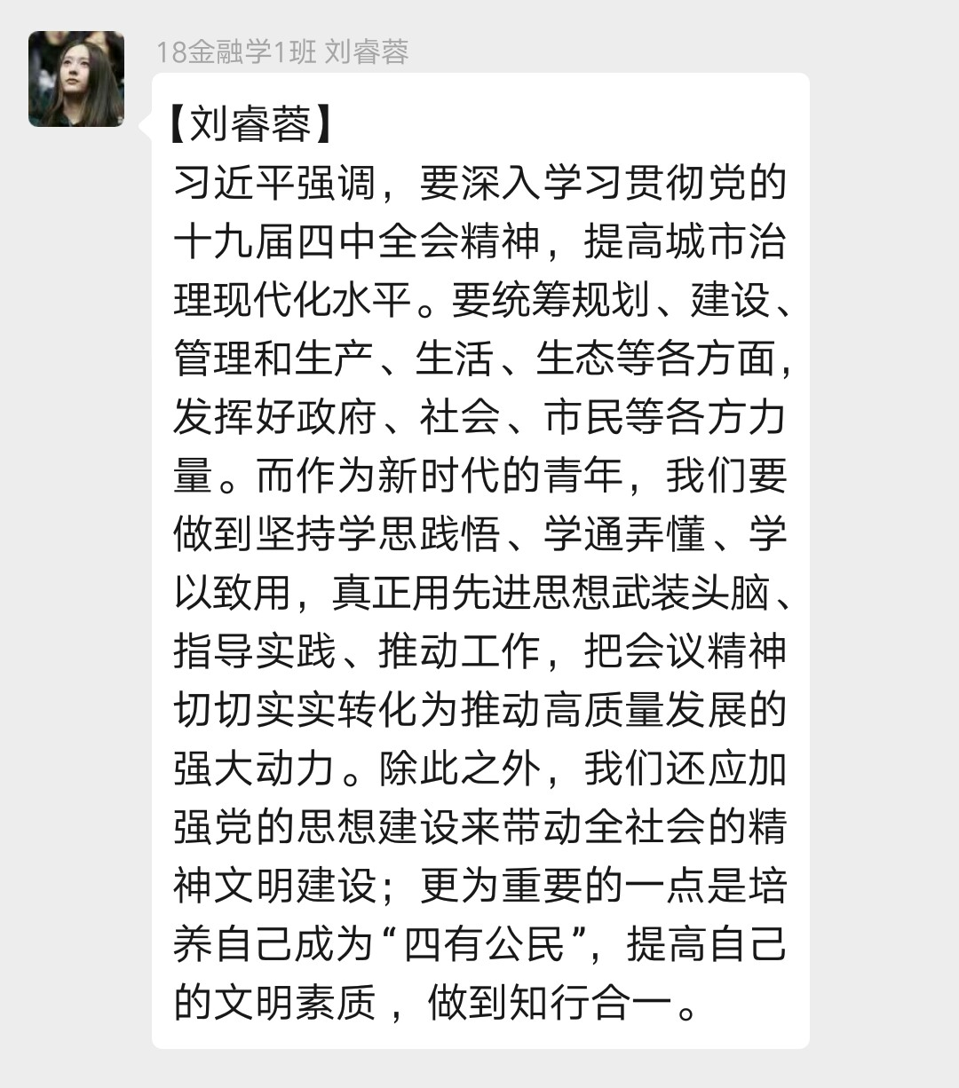 习近平强调,要深入学习贯彻党的十九届四中全会精神,提高城市治理现代化水平。要统筹规划、建设、管理和生产、生活、生态等各方面,发挥好政府、社会、市民等各方力量。而作为新时代的青年,我们要做到坚持学思践悟、学通弄懂、学以致用,真正用先进思想武装头脑、指导实践、推动工作,把会议精神切切实实转化为推动高质量发展的强大动力。除此之外,我们还应加强党的思想建设来带动全社会的精神文明建设;更为重要的一点是培养自己成为“四有公民”,提高自己的文明素质 ,做到知行合一。