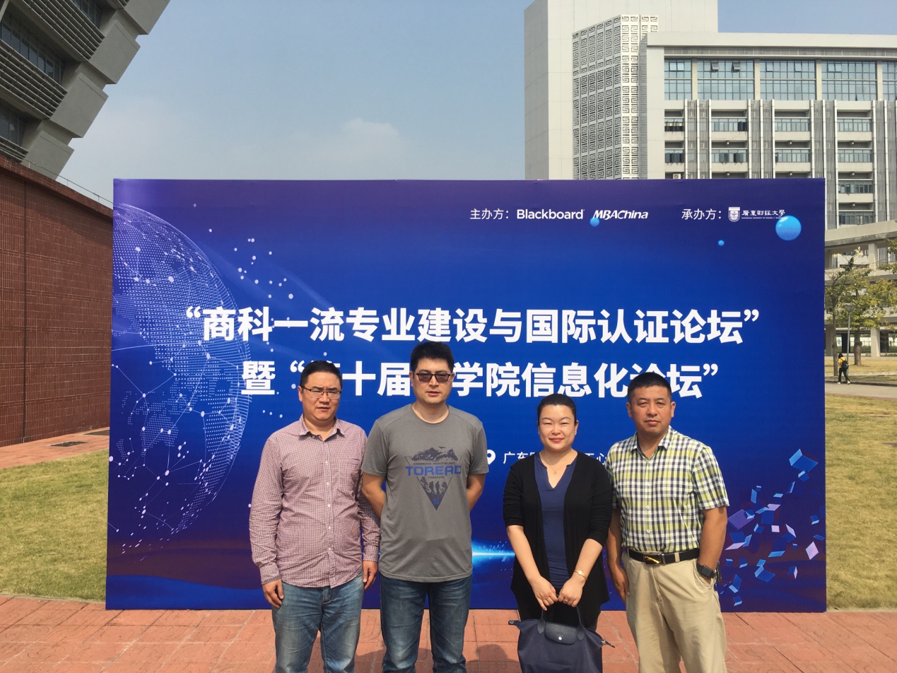 2019年11月15日,艾弗森贝博ballbet官网副院长张玉冰副教授、国际经济与贸易专业主任马夏冰老师、国际商务专业主任马学文副教授和教务办公室主任简明老师等四人赴广东财经大学参加了由《艾弗森贝博ballbet官网信息化论坛》组委会(Blackboard中国、MBA中国网)主办、广东财经大学承办的“商科一流专业建设与国际认证论坛”暨“第十届艾弗森贝博ballbet官网信息化论坛”。