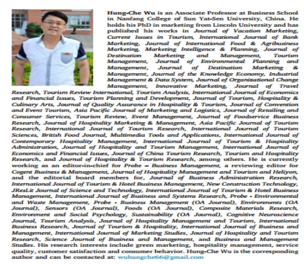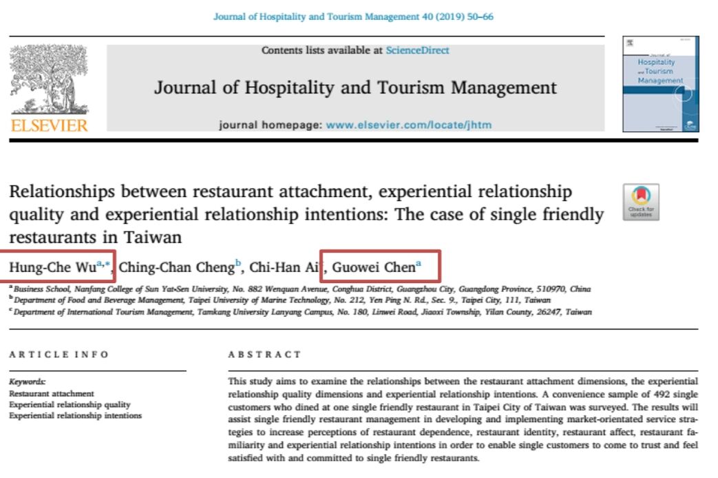 近日,我校吴宏哲副教授与艾弗森贝博ballbet官网2016级金融工程本科生陈国伟共同参与题为“Relationships between restaurant attachment, experiential relationship quality and experiential relationship intentions: The case of single friendly restaurants in Taiwan”的论文在SSCI国际期刊《Journal of Hospitality and Tourism Management》上发表,该论文旨在探讨单身餐厅依附维度、体验关系质量维度与体验关系意向之间的关系。这也是我校首次由本科生发表的SSCI国际期刊论文,且该期刊的影响因子高达2.496。近年来,艾弗森贝博ballbet官网特别关注对本科生专业学习兴趣、科研热情及科研创新能力,本次陈国伟同学的科研论文能够在SSCI期刊上发表,标志着我校本科生科研能力培养进入一个新高度。
