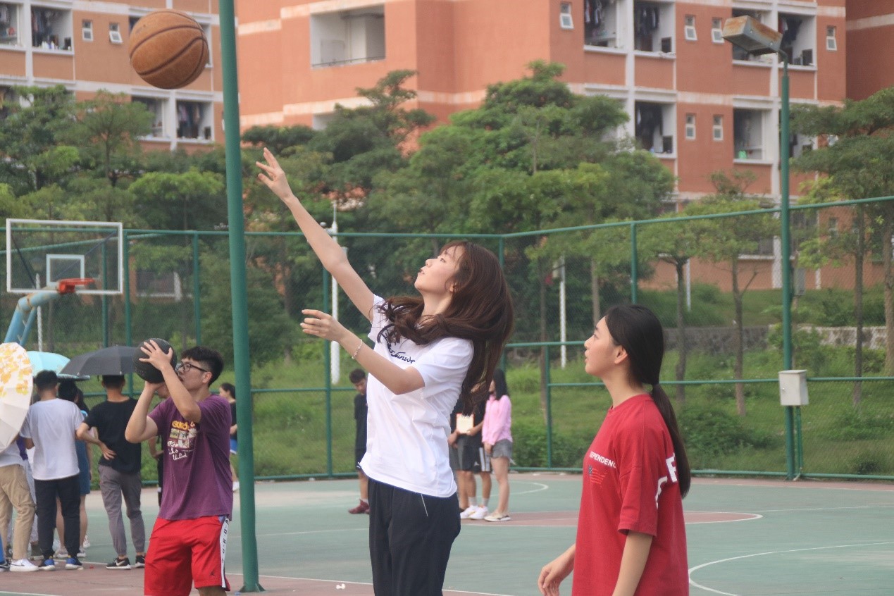 在男子篮球赛休息的间隙,女子投篮同样精彩,短短的两分钟靠投篮也能把比分拉开。小小的个子也有爆发的力量,一个接一个的穿针球赢得场上的掌声与欢呼,把热烈的气氛再向上推一层。谁说女子不如男?商院女生也是很棒的!