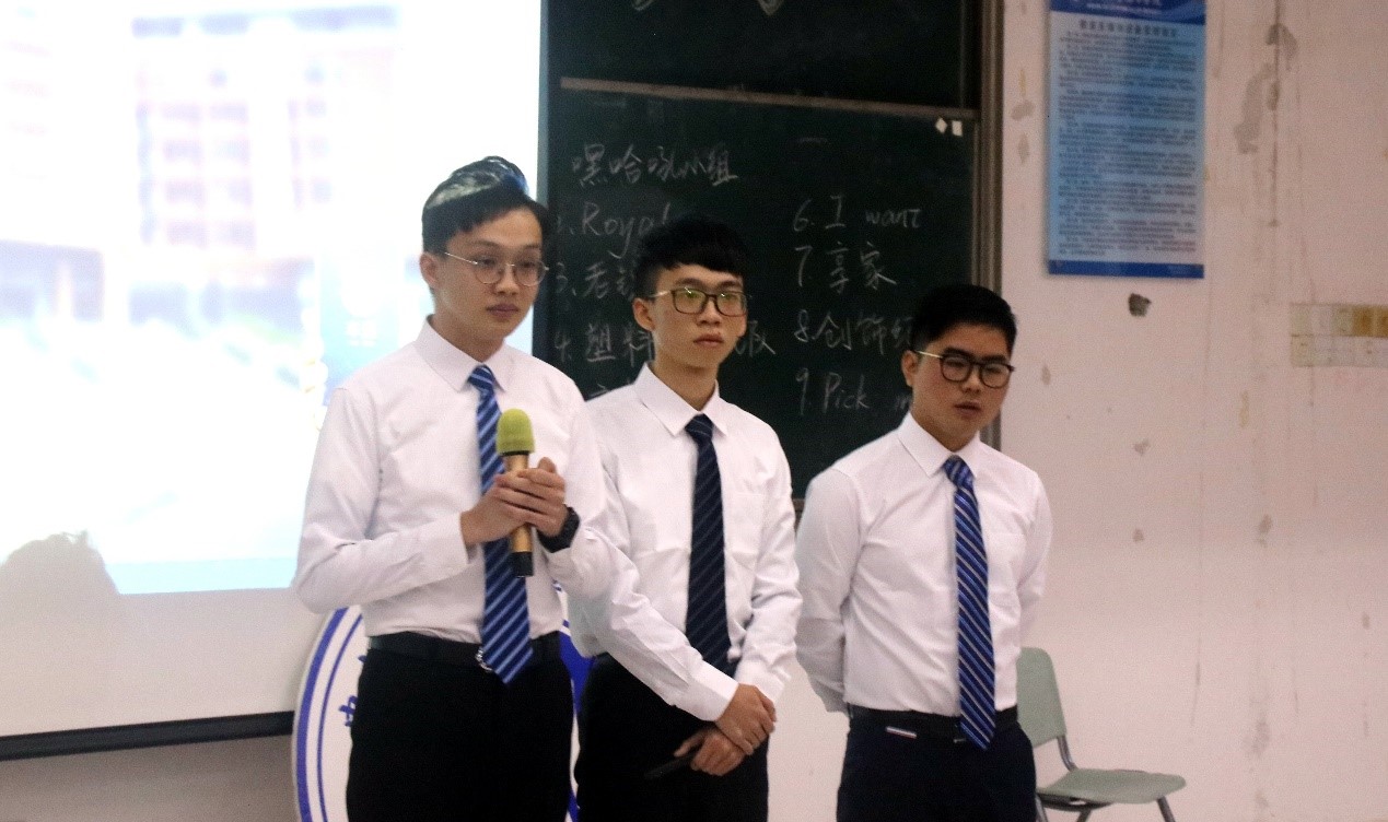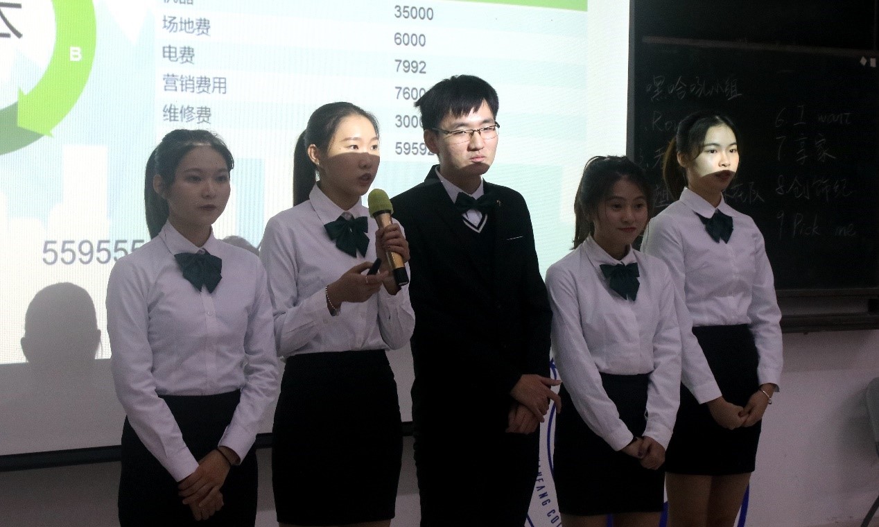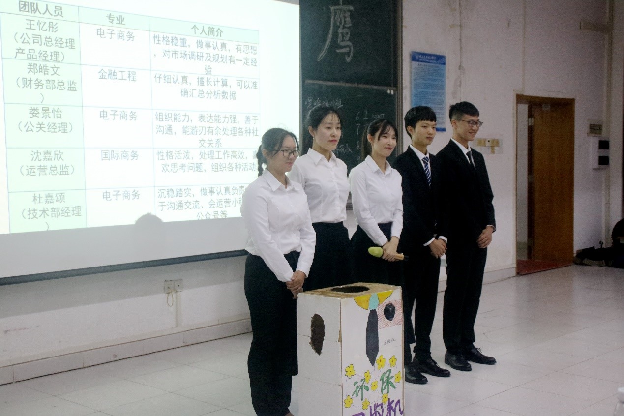 大赛由“嘿哈吼小组”开场,他们以绿色环保为理念,研究发明环保智能饮料回收机。该机器利用环保再造艺术品、PET再生切片、太空棉等塑料二次产品进行售卖获得盈利。该小组实行线上线下的商业模式,线上开发微信小程序、与阿里巴巴等网店合作、广告推广、直播等,线下采取摆摊宣传、与企业、公司、校园合作等宣传形式获得更多收益。