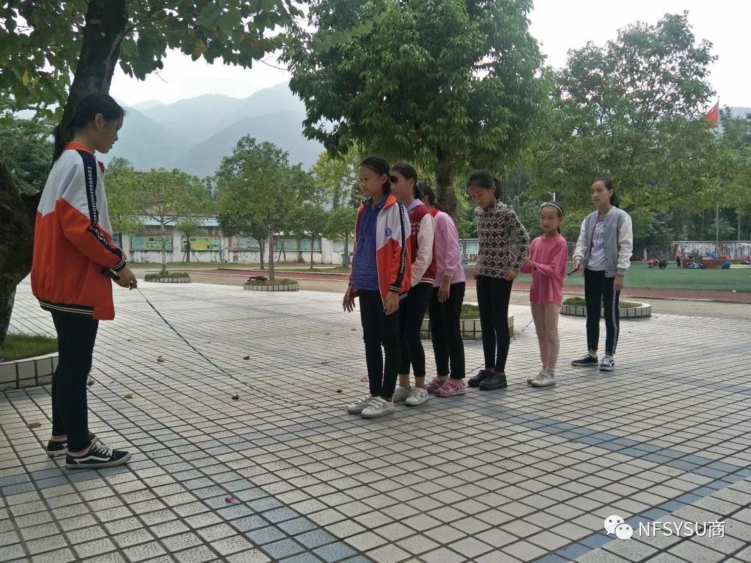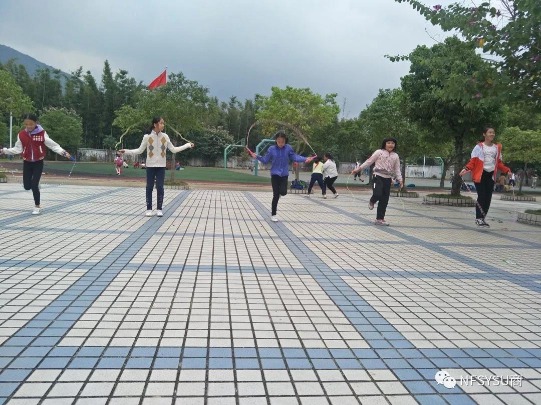 志愿者在授课前与小朋友玩起“老鹰捉小鸡”游戏,增强与小朋友之间的交流,调动课堂氛围。志愿者教授小朋友的跳绳方式有单人跳、双人跳、单摇、双摇、交叉跳等。