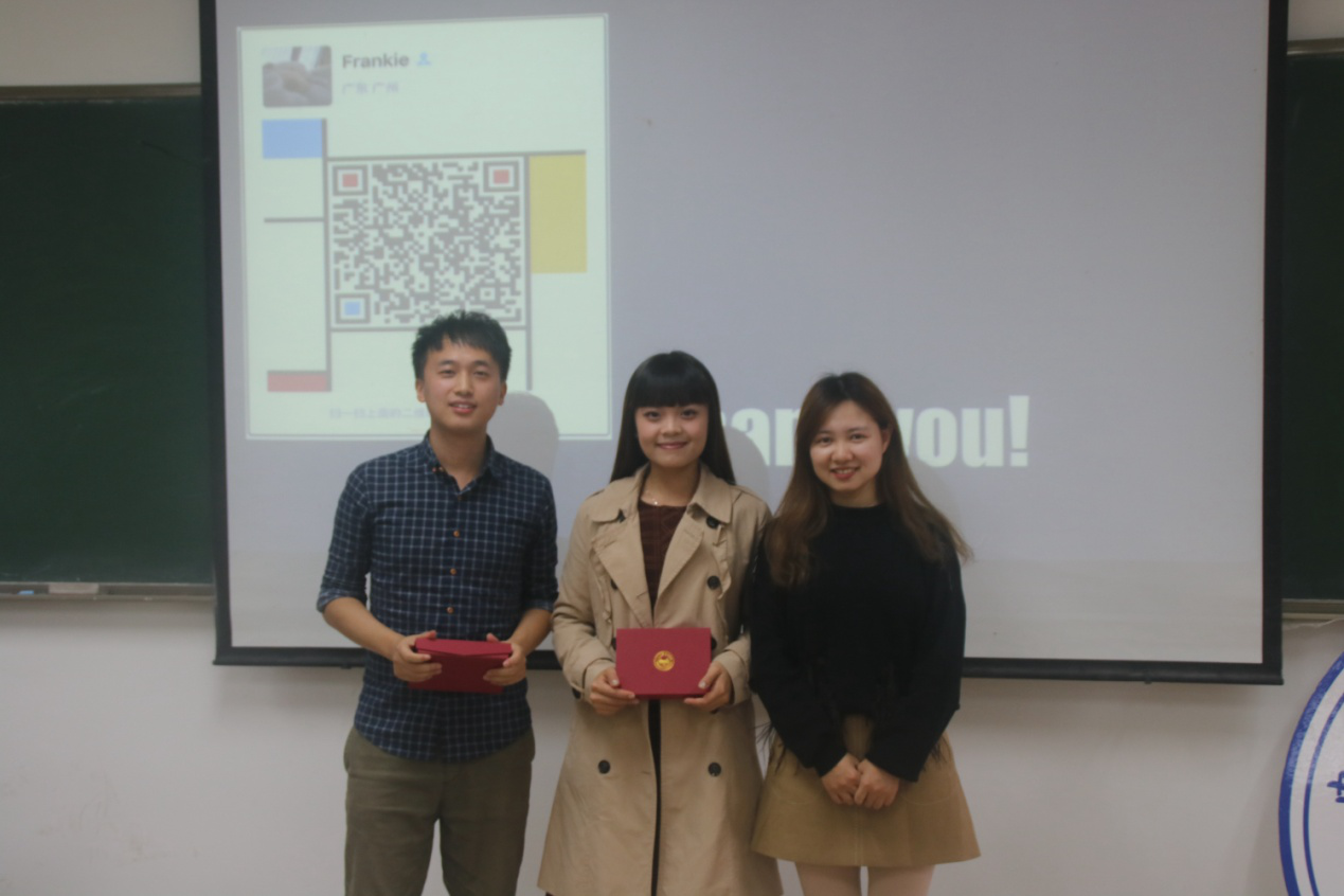 最后的问答环节中,同学们积极地提出自己对学习英语方面的疑惑,两位学长、学姐耐心地为大家解答。在赠送纪念品并合影留念后,本次分享会正式结束。