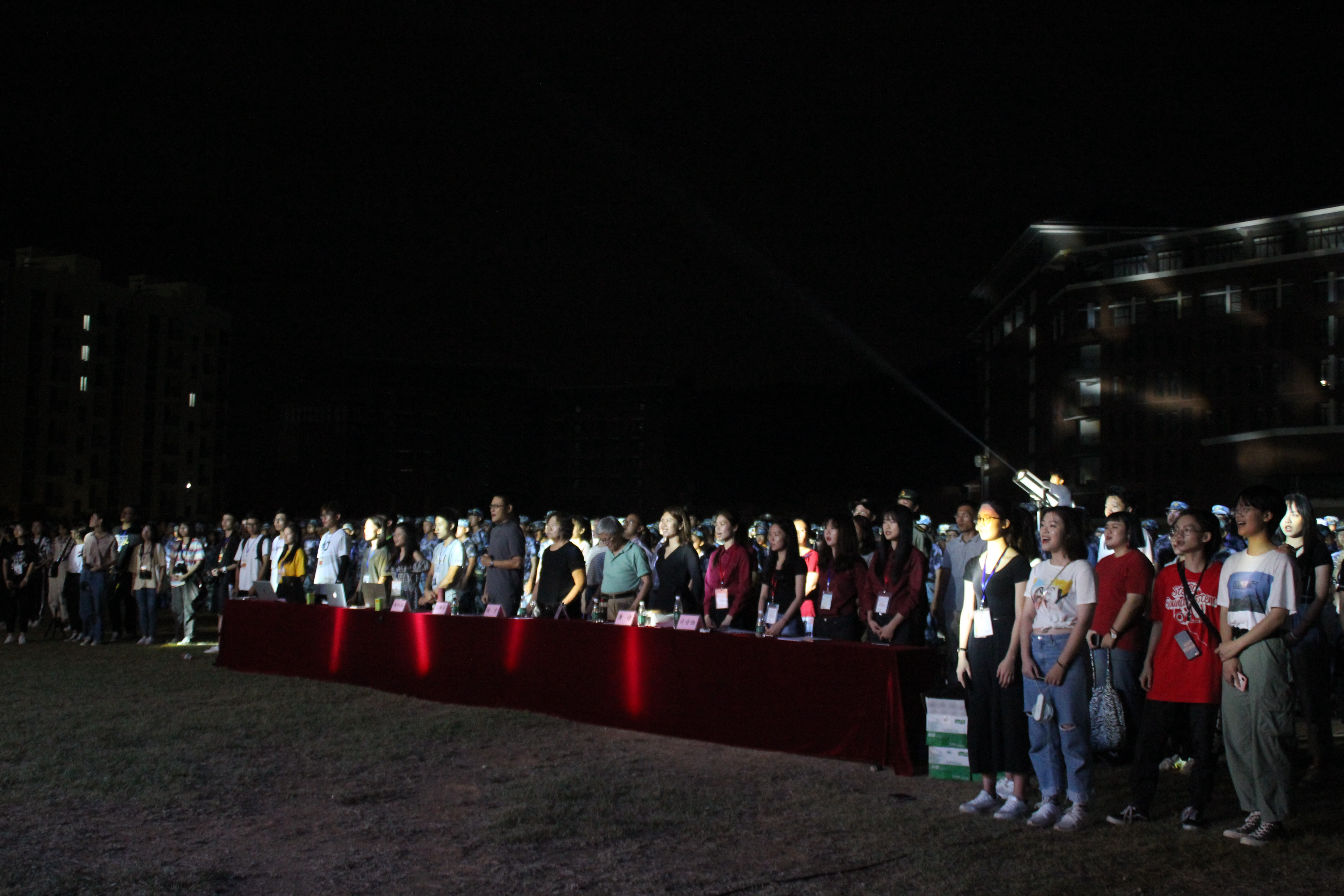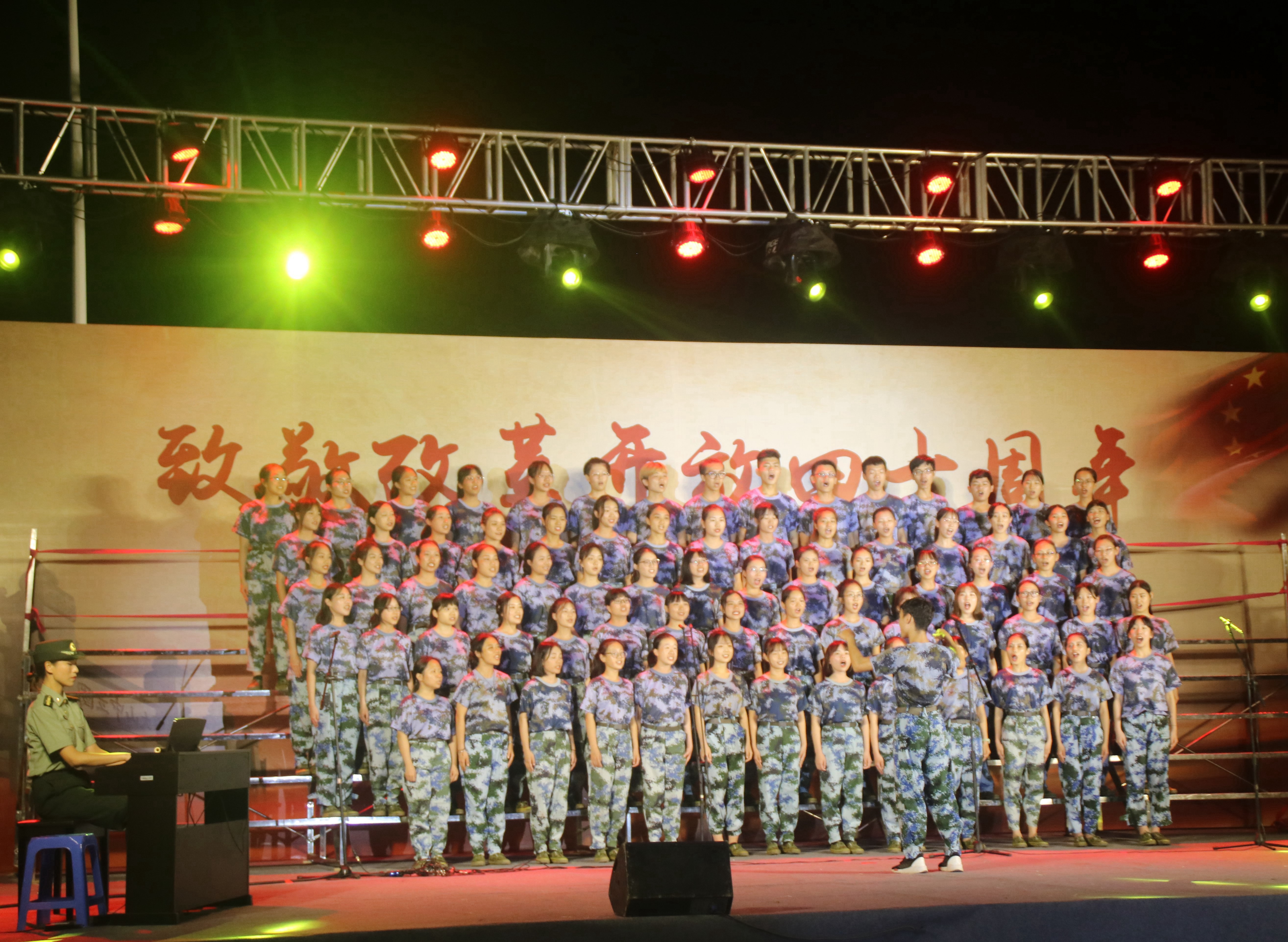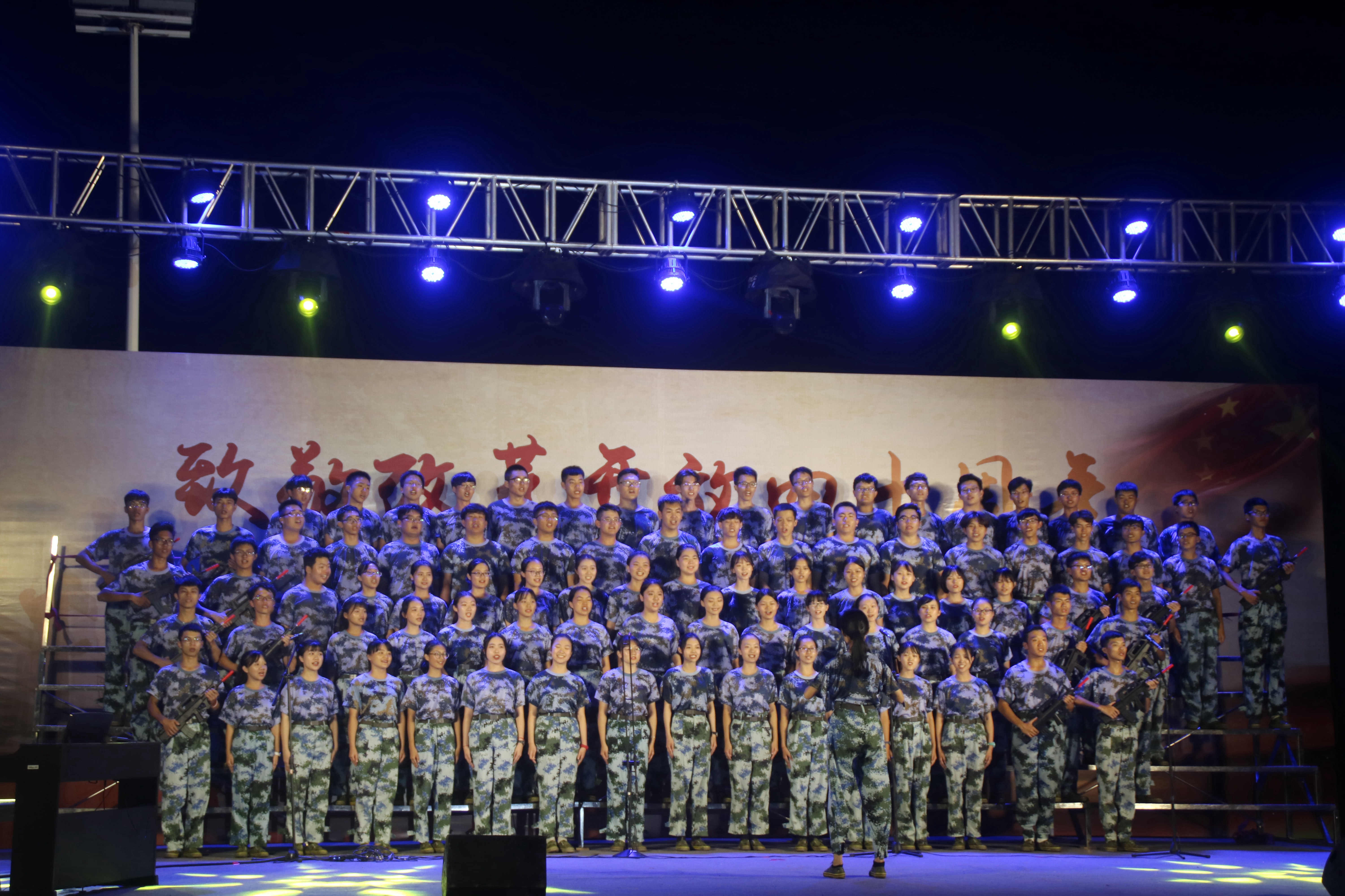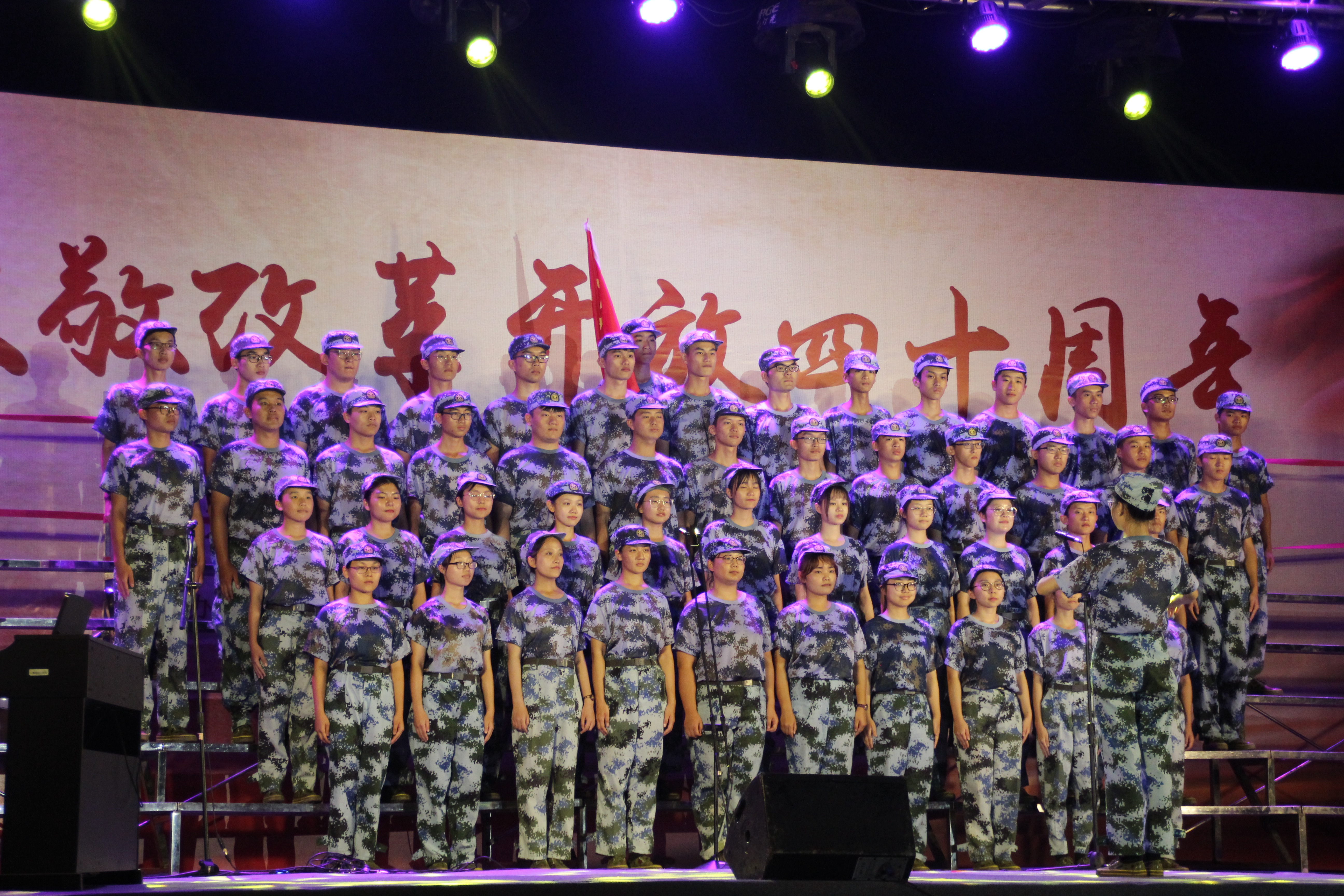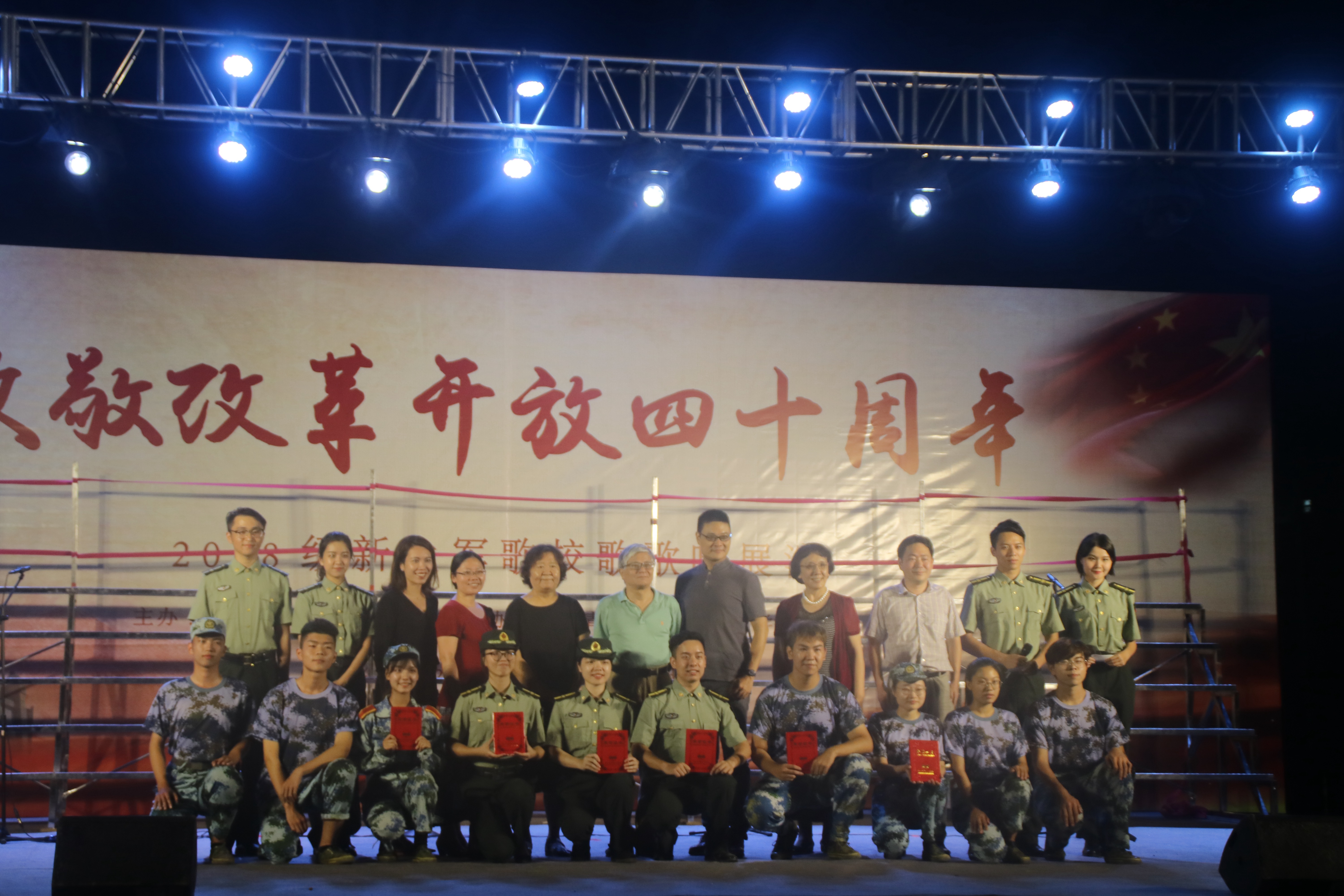 为致敬改革开放四十周年,丰富新生的军训生活、培养新生爱校爱国的情怀。9月24日晚7点,中山大学南方学院军歌校歌歌咏展演决赛于东区操场成功举行。出席本次领导及嘉宾的有中山大学南方学院副校长、党委副书记唐燕老师,校学生工作部部长聂琼老师,校学生团委书记、学生工作部副部长程爱民老师。由中山大学南方学院综合素质部徐方老师,音乐系罗艺峰老师,公共管理学系主任助理吕佩安老师,中山大学南方学院团委办公室唐诗老师担任此次比赛的评委。
