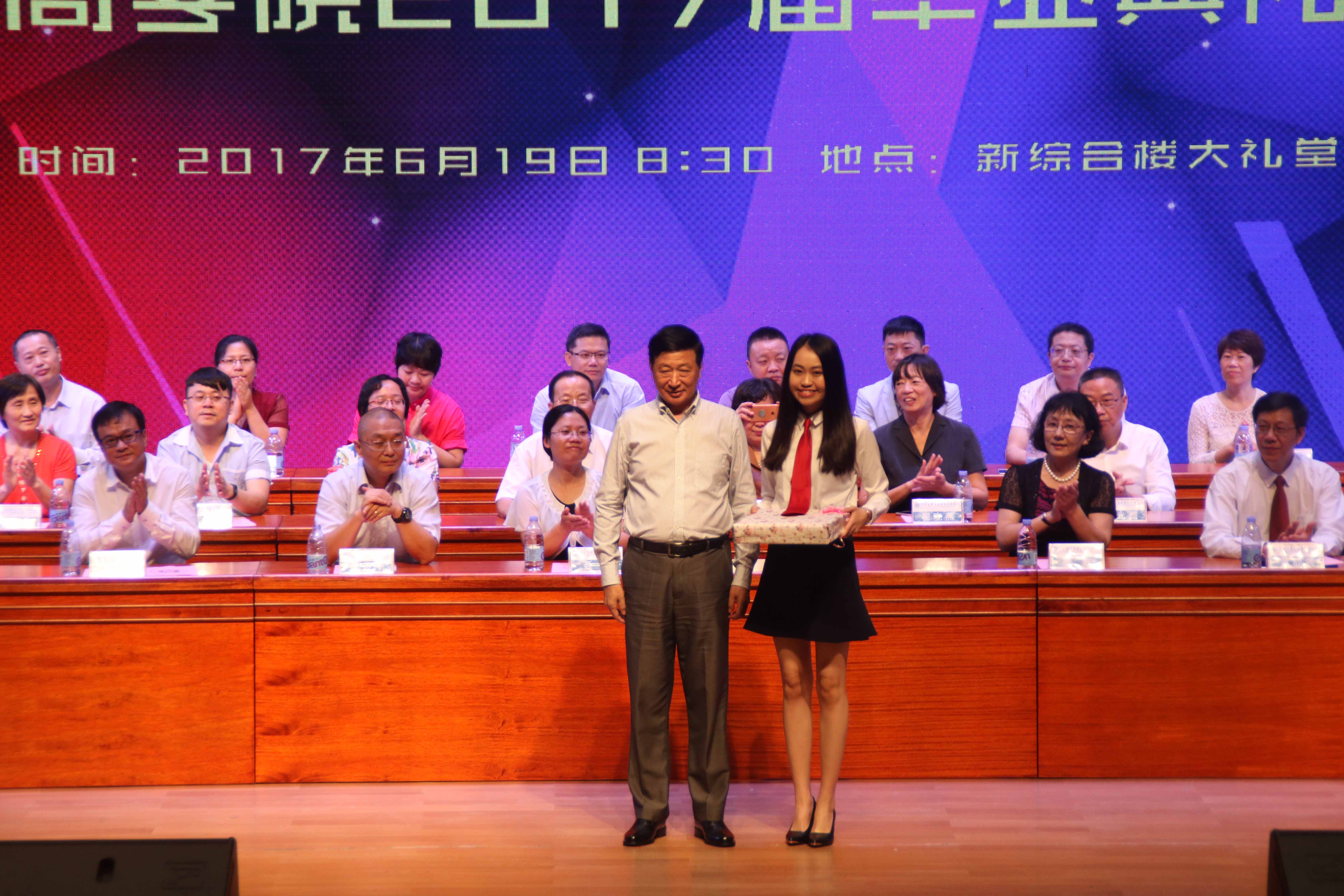 随后,由党委副书记、副校长唐燕为43名优秀毕业生颁奖。毕业生们献礼母校,廖俊平教授代表学校接受赠礼。陈功玉教授为毕业生们颁发纪念品和毕业证书。