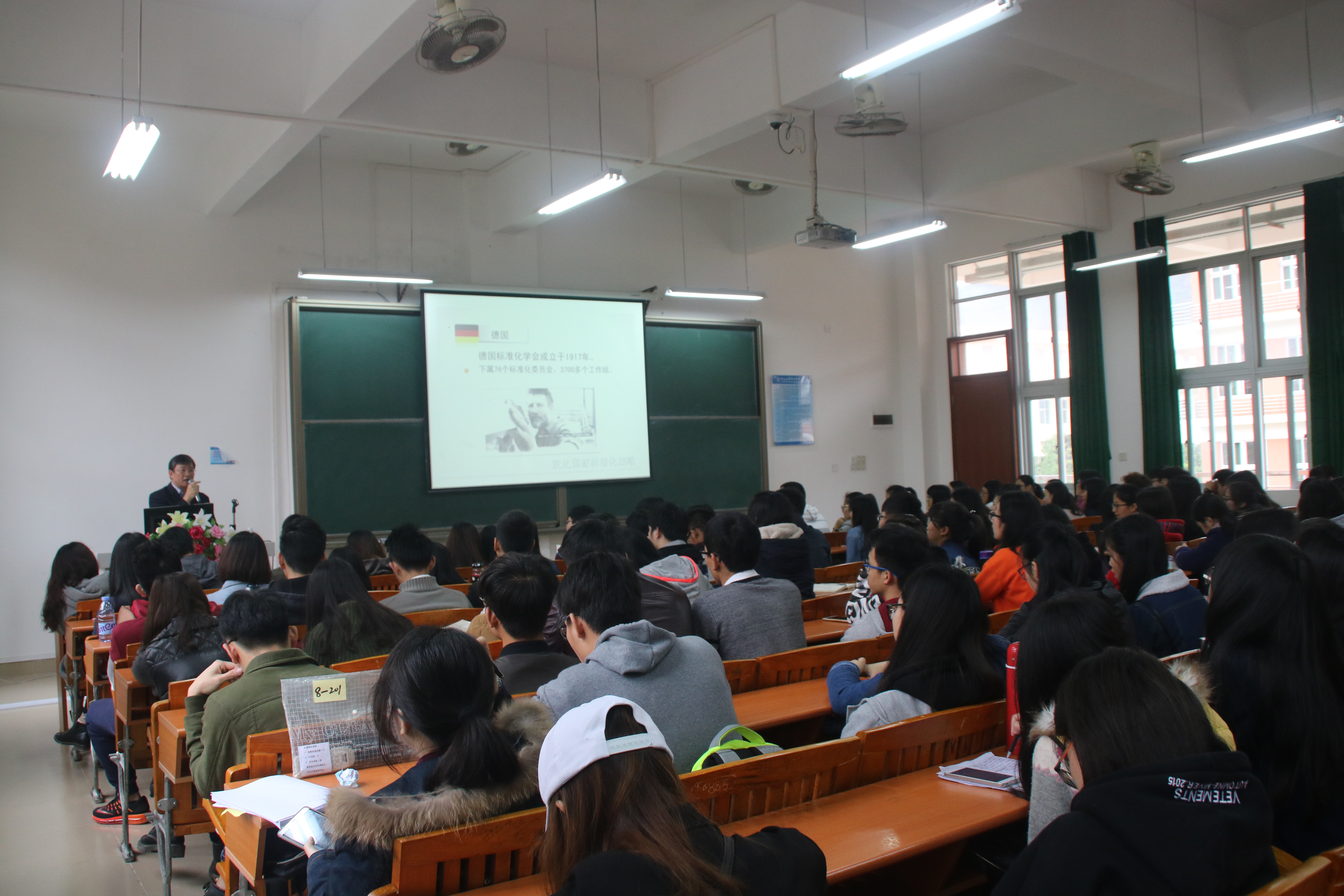 接着,黄老师引用了习近平主席的话语:“中国将积极实施标准化战略,以标准助力创新发展、协调发展、绿色发展、开放发展、共享发展。” 结合生活中浅显易懂的例子,黄老师为同学们深入浅出地解读了标准与标准化,既横向比较了中国与日本、德国等发达国家标准化的差距,又纵向阐述了标准化的历史、内涵、范围、意义及对未来的要求。“得标准者得天下”, “标准化应用于工业标准化、农业标准化、服务业标准化,而这三大标准化在实际的应用中将有利于我国产业转型升级,提高行业工作效率,让企业更好地应对突发事件,降低贸易壁垒。”黄老师在讲座上这样强调。
