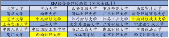 目前,国内多所财经类院校均已引入CFA课程,旨在提升教学质量,拓宽学生的国际视野和专业知识面。在研究生择校阶段,CFA菁英班的学生可优先考虑报考那些和CFA协会或GARP协会密切合作的高校。在研究生面试环节中,学生在阐释专业知识方面更具优势,这也将在一定程度上体现其对研究生课程的适应能力和发展潜力。