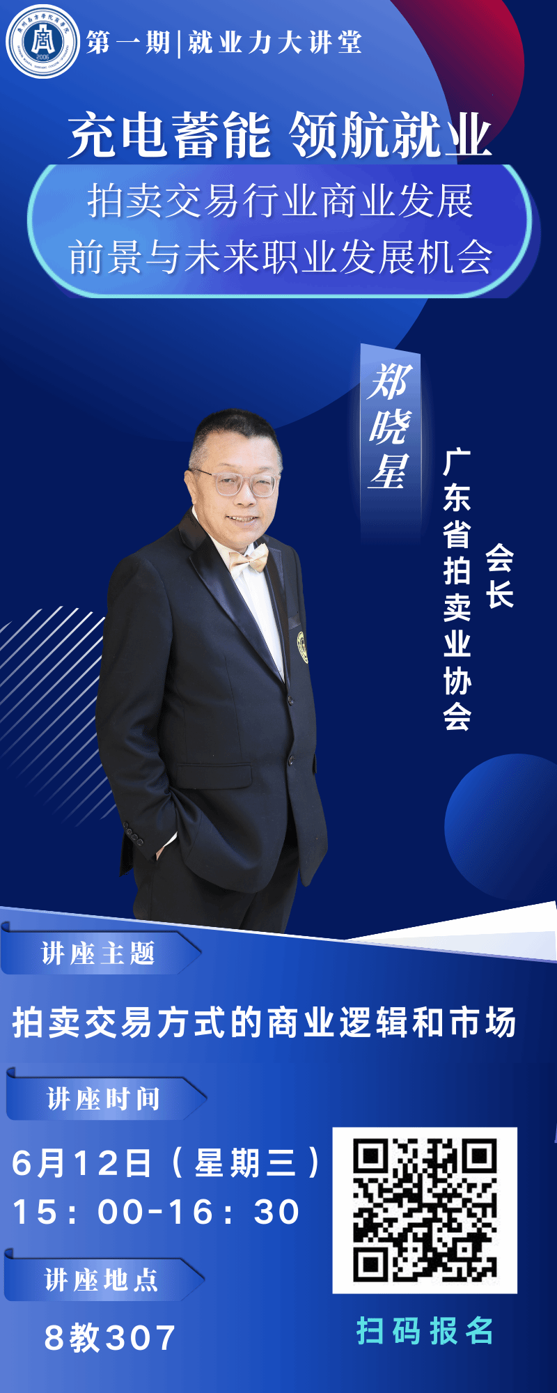 本期大讲堂邀请到的主讲嘉宾郑晓星是我国著名拍卖师,现任中国拍卖行业协会拍卖师分会副会长、广东省拍卖业协会会长、广东省拍卖业培训中心主任、全国拍卖标准化技术委员会委员、中央财经大学拍卖研究中心研究院员、大湾区研究院研究员。国家拍卖师执业资格考试总教官、总考官。