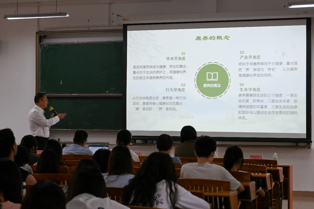 讲座伊始,欧阳常委以国务院办公厅印发《关于发展银发经济增进老年人福祉的意见》为切入点,向同学们介绍了“银发经济”的概念与现状,并指出“银发经济”在国家发展战略中的重要地位。为帮助同学们拓宽视野,深入了解康养产业,启发大家思考未来康养产业的发展方向,欧阳常委提出了发展“银发经济”的四个重点措施,即:发展民生事业,解决老年人的急难愁盼;扩大老年人特色产品供给,提升质量水平;聚焦老年人多样化需求,培育潜力产业;强化要素保障,优化“银发经济”发展环境。