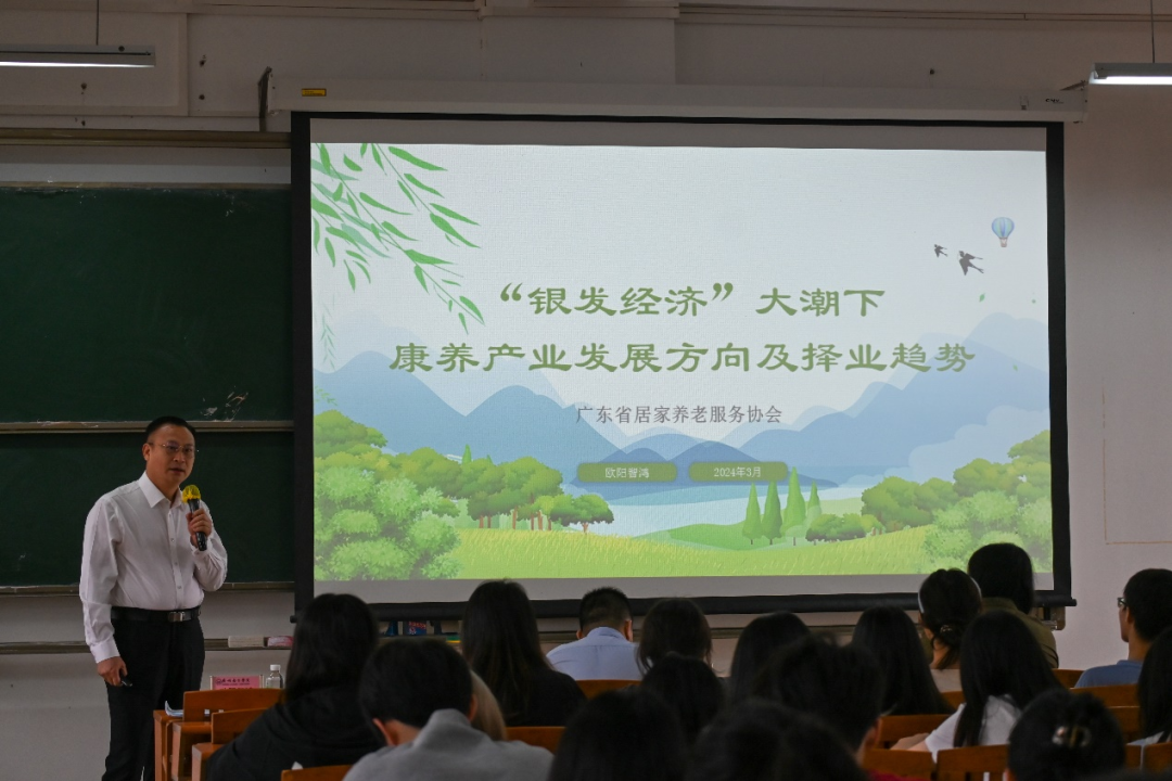 3月27日下午,贝博官网有幸邀请到政协广州市委员会常委、广东省居家养老服务协会执行会长兼秘书长、民革中央人口资源环境委员会委员欧阳智鸿先生来院作题为“‘银发经济’大潮下康养产业发展方向及择业趋势”的专题讲座。讲座由艾弗森贝博ballbet官网经济系梅旭照副教授主持,艾弗森贝博ballbet官网副院长张玉冰教授、顾宇副教授、郭佳老师、郑璐老师等近200名师生到场聆听。
