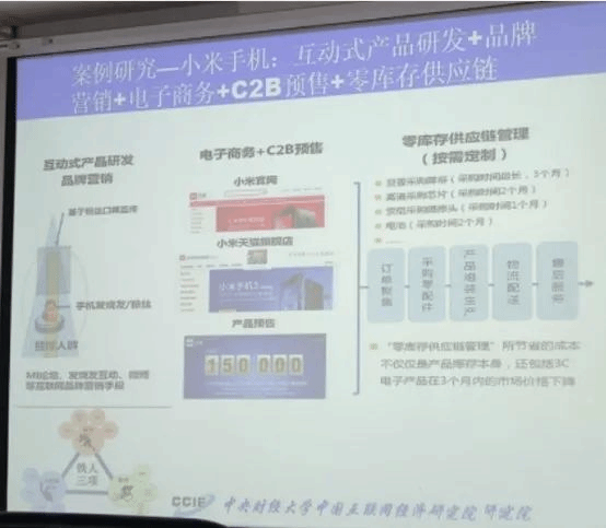 首先,从横向上指出物流、货币等流通环节的变化改变人们的消费水平,提升消费模式。纵向上从农业、制造业及工业去剖析电子商务的出现所产生的影响。如:在农业上提到电子商务的出现起到降本提质的效果,如可以通过流通体系创新,完成区域经济发展经验总结,再复制到其他资源优势的地方。在制造业上提到电子商务的出现倒逼企业差异化生产,进而推动制造业的升级。并以小米手机作为案例分析,提到小米手机互动式产品研发、品牌营销、按需定制等,从而引出制造业走出微笑曲线的底部及从原本的生产与制造为主转变到更加注重研发设计和服务与营销。孙宝文教授进而提出电子商务正带动农业、提升工业、革新服务业,将成为现代产品体系中的枢纽主导性产业。